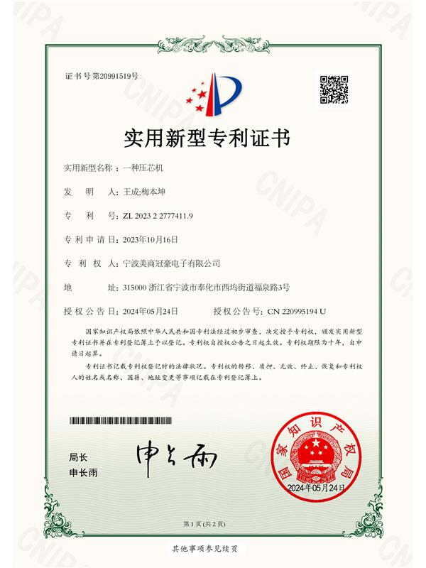• 實(shí)用型專利證書